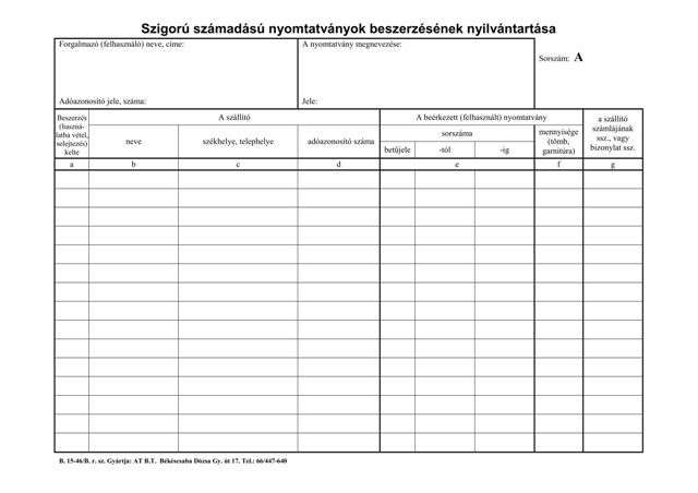 Szigorú számadású nyomtatványok beszerzésének nyilvántartása B.15-46/B